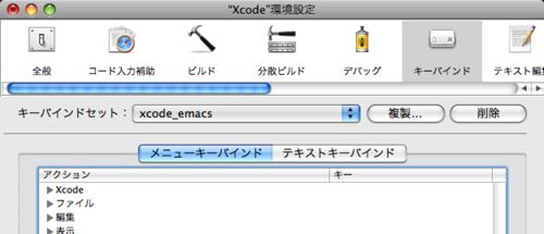 Xcodeのキーバインドセットは「環境設定」の中から変更する事ができます。独自のカスタマイズをする場合は既存のキーバインドセットを複製して、複製した定義ファイルに手を加えていくことになります。 xcode_emacsというキーバインドセットを複製した場合、…