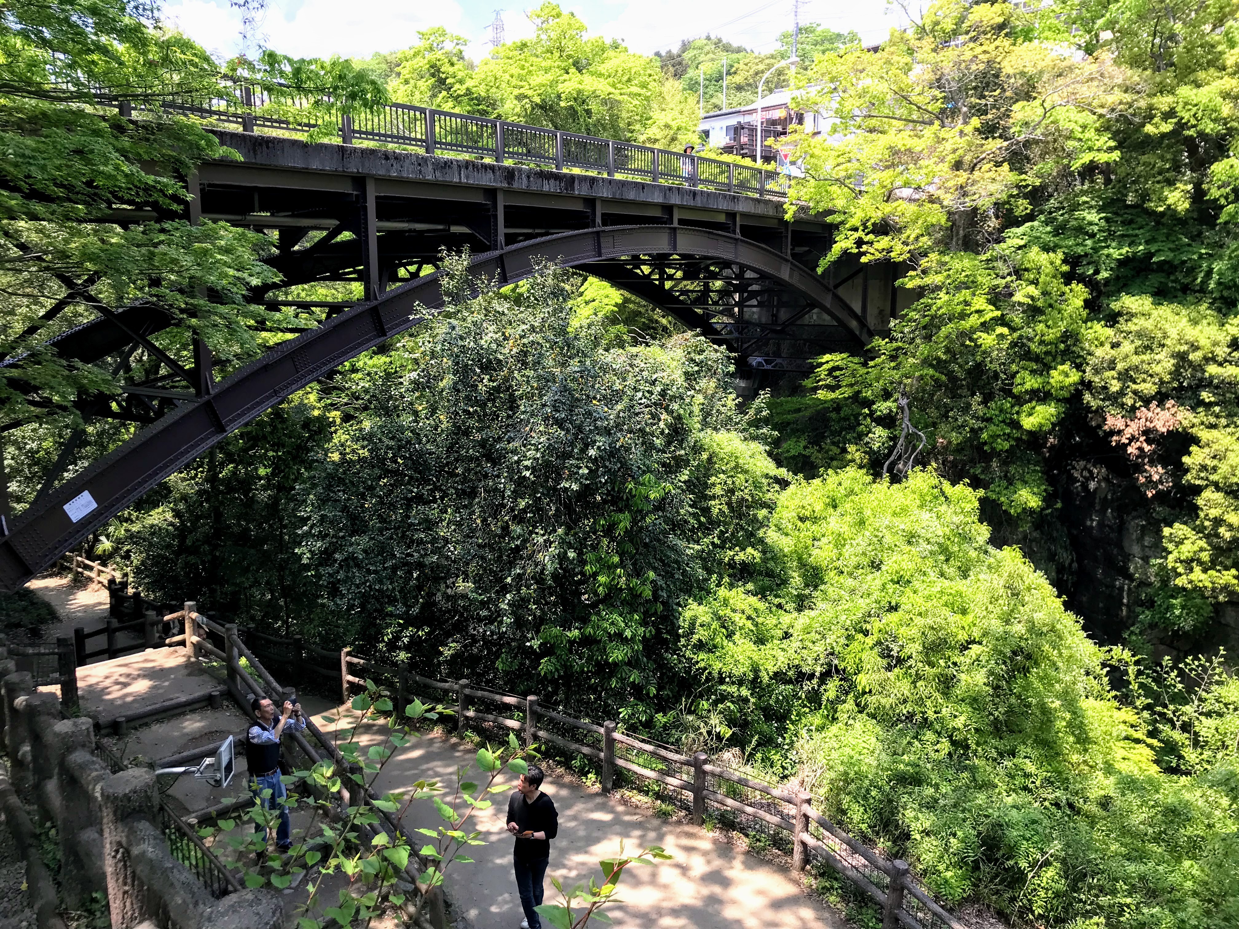 赤い鉄橋が新緑に映えてて良いかんじ. ちょうど電車が通りかかったタイミングで撮影できた